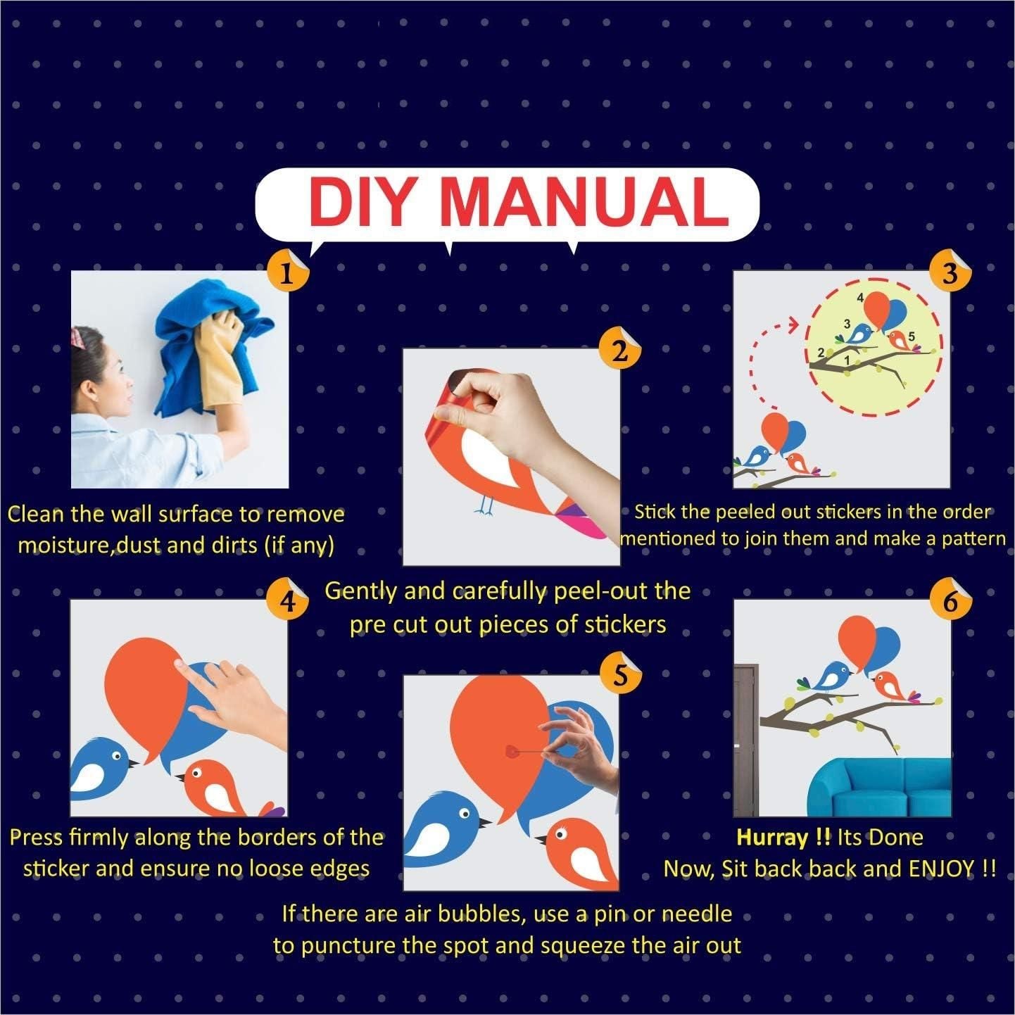 Product Name: Leaves Design Vinyl Wall Sticker (Set of 5) Package Contains: 5 Item Wall Decor Stickers Material: Polyvinyl Color: Color as per availability Dimension:19 X 19 cm Weight: 200 Additional Information:Self-adhesive backing removes without any surface damage. For best results, mount to a smooth surface. We use high-quality sticker to give a 'hand-painted" look. These are easy to apply to any smooth surface. Put them on walls, wood, glass, tile, windows - Use your imagination! It can be easily removed although they cannot be re positioned or reused. Special Instructions: 1.) Please do not stick on Wet Walls 2.) Make sure the newly painted walls are cured properly 3.) Clean the surface and free from dust or contaminations 4.) Peel the pre-cut wall sticker pieces from the paper and paste it on your surface with your creative ideas
